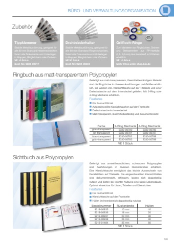 B%u00dcRO- UND VERWALTUNGSORGANISATION103Stabile Metallausf%u00fchrung, geeignet f%u00fcr alle 80 mm Standard Hebelmechaniken, fixiert alle Dokumente und Unterlagen in Mappen, Ringb%u00fcchern oder Ordnern.VE 10 St%u00fcckBest-Nr.: 9604-00917Stabile Metallausf%u00fchrung, geeignet f%u00fcr alle 80 mm Standard Ringmechaniken, fixiert alle Dokumente und Unterlagen in Mappen, Ringb%u00fcchern oder Ordnern.VE 50 St%u00fcckBest-Nr.: 9604-00904Zum Markieren von Ringb%u00fcchern, Ordnern und Stehsammlern aus PP-Hartfolie (1,2 - 2,0 mm). Aus Kunststoff, in 10 Farben erh%u00e4ltlich. VE 10 St%u00fcckMehr Infos unter shop.boi.deTippklemmer Drahtniederhalter Griffloch-RingeRingbuch aus matt-transparentem PolypropylenGefertigt aus matt-transparentem, l%u00f6semittelbest%u00e4ndigem Material sind die Ringb%u00fccher in diversen Ausf%u00fchrungen und Gr%u00f6%u00dfen erh%u00e4ltlich. Sie werden inkl. Klarsichttasche auf der Titelseite und einer Dreieckstasche auf dem Innendeckel geliefert. Mit 2-Ring oder 4-Ring Mechanik erh%u00e4ltlich. Features%uf06e F%u00fcr Format DIN A4%uf06e Aufgeschwei%u00dfte Klarsichttaschen auf der Frontseite%uf06e Dreieckstasche im Innendeckel%uf06e Matt-transparent, l%u00f6semittelbest%u00e4ndig und dokumentenechtFarbe 2-Ring Mechanik 4-Ring Mechanikgrau-transparent 9330-00780 9330-00786rot-transparent 9330-00781 9330-00787blau-transparent 9330-00782 9330-00788gr%u00fcn-transparent 9330-00783 9330-00789VE 1 St%u00fcckSichtbuch aus PolypropylenGefertigt aus umweltfreundlichem, schwarzem Polypropylen sind Ausf%u00fchrungen in diversen R%u00fcckenbreiten erh%u00e4ltlich. Eine Klarsichttasche erm%u00f6glicht das leichte Auswechseln von Deckbl%u00e4ttern auf Titelseite. Die eingeschwei%u00dften Klarsichth%u00fcllen sind dokumentenecht, reflexarm, lassen sich doppelseitig nutzen und bieten bei leichter Nutzung eine lange Lebensdauer. Optimal einsetzbar f%u00fcr Listen, Tabellen und %u00dcbersichten. Features%uf06e F%u00fcr Format DIN A4%uf06e Klarsichttasche auf der Frontseite%uf06e H%u00fcllen im Innenbereich doppelseitig nutzbarBestellnummer R%u00fcckenbreite H%u00fcllen9218-00935 10 mm 109218-00936 18 mm 209218-00937 23 mm 309218-00938 26 mm 409218-01484 35 mm 60VE 1 St%u00fcckZubeh%u00f6r