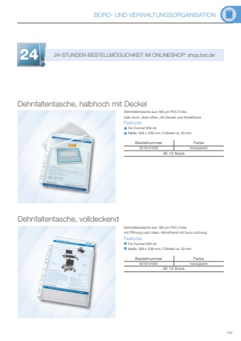 B%u00dcRO- UND VERWALTUNGSORGANISATION10924-STUNDEN-BESTELLM%u00d6GLICHKEIT IM ONLINESHOP: shop.boi.deBestellnummer Farbe9218-01055 transparentVE 10 St%u00fcckBestellnummer Farbe9218-01061 transparentVE 10 St%u00fcckDehnfaltentasche, halbhoch mit DeckelDehnfaltentasche aus 180 %u00b5m PVC-Folie, halb-hoch, oben offen, mit Deckel und Abheftrand.Features%uf06e F%u00fcr Format DIN A4%uf06e Ma%u00dfe: 309 x 238 mm, F%u00fclltiefe ca. 20 mmDehnfaltentasche, volldeckendDehnfaltentasche aus 180 %u00b5m PVC-Folie, mit %u00d6ffnung nach oben, Abheftrand mit Euro-Lochung.Features%uf06e F%u00fcr Format DIN A4%uf06e Ma%u00dfe: 309 x 238 mm, F%u00fclltiefe ca. 20 mm