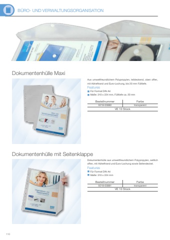 B%u00dcRO- UND VERWALTUNGSORGANISATION110Dokumentenh%u00fclle MaxiAus umweltfreundlichem Polypropylen, teildeckend, oben offen, mit Abheftrand und Euro-Lochung, bis 20 mm F%u00fclltiefe.Features%uf06e F%u00fcr Format DIN A4%uf06e Ma%u00dfe: 310 x 224 mm, F%u00fclltiefe ca. 20 mmDokumentenh%u00fclle aus umweltfreundlichem Polypropylen, seitlich offen, mit Abheftrand und Euro-Lochung sowie Seitendeckel.Features%uf06e F%u00fcr Format DIN A4%uf06e Ma%u00dfe: 310 x 224 mmBestellnummer Farbe9218-00880 transparentVE 10 St%u00fcckBestellnummer Farbe9218-00881 transparentVE 10 St%u00fcckDokumentenh%u00fclle mit Seitenklappe