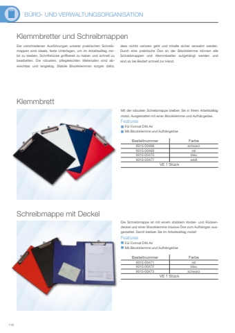 B%u00dcRO- UND VERWALTUNGSORGANISATION116KlemmbrettSchreibmappe mit Deckel Mit der robusten Schreibmappe bleiben Sie in Ihrem Arbeitsalltag mobil. Ausgestattet mit einer Blockklemme und Aufh%u00e4nge%u00f6se. Features%uf06e F%u00fcr Format DIN A4%uf06e Mit Blockklemme und Aufh%u00e4nge%u00f6seDie Schreibmappe ist mit einem stabilem Vorder- und R%u00fcckendeckel und einer Blockklemme inlusive %u00d6se zum Aufh%u00e4ngen ausgestattet. Damit bleiben Sie im Arbeitsalltag mobil!Features%uf06e F%u00fcr Format DIN A4%uf06e Mit Blockklemme und Aufh%u00e4nge%u00f6seBestellnummer Farbe9015-00468 schwarz9015-00469 rot9015-00470 blau9015-00477 wei%u00dfVE 1 St%u00fcckBestellnummer Farbe9015-00471 rot9015-00472 blau9015-00473 schwarzVE 1 St%u00fcckKlemmbretter und SchreibmappenDie verschiedenen Ausf%u00fchrungen unserer praktischen Schreibmappen sind ideale, feste Unterlagen, um im Arbeitsalltag mobil zu bleiben, Schriftst%u00fccke griffbereit zu haben und schnell zu bearbeiten. Die robusten, pflegeleichten Materialien sind abwischbar und langlebig. Stabile Blockklemmen sorgen daf%u00fcr, dass nichts verloren geht und Inhalte sicher verwahrt werden. Durch eine praktische %u00d6se an der Blockklemme k%u00f6nnen alle Schreibmappen und Klemmbretter aufgeh%u00e4ngt werden und sind so bei Bedarf schnell zur Hand.