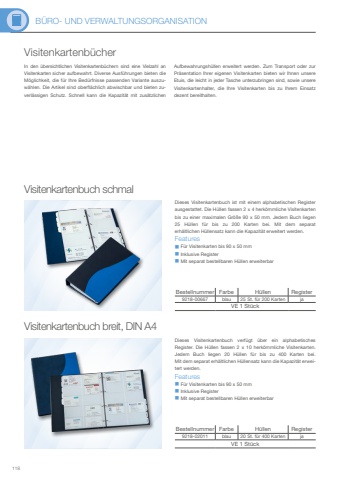 B%u00dcRO- UND VERWALTUNGSORGANISATION118Visitenkartenbuch schmalVisitenkartenbuch breit, DIN A4Dieses Visitenkartenbuch ist mit einem alphabetischen Register ausgestattet. Die H%u00fcllen fassen 2 x 4 herk%u00f6mmliche Visitenkarten bis zu einer maximalen Gr%u00f6%u00dfe 90 x 50 mm. Jedem Buch liegen 25 H%u00fcllen f%u00fcr bis zu 200 Karten bei. Mit dem separat erh%u00e4ltlichen H%u00fcllensatz kann die Kapazit%u00e4t erweitert werden.Features%uf06e F%u00fcr Visitenkarten bis 90 x 50 mm%uf06e Inklusive Register%uf06e Mit separat bestellbaren H%u00fcllen erweiterbarDieses Visitenkartenbuch verf%u00fcgt %u00fcber ein alphabetischesRegister. Die H%u00fcllen fassen 2 x 10 herk%u00f6mmliche Visitenkarten. Jedem Buch liegen 20 H%u00fcllen f%u00fcr bis zu 400 Karten bei. Mit dem separat erh%u00e4ltlichen H%u00fcllensatz kann die Kapazit%u00e4t erweitert werden.Features%uf06e F%u00fcr Visitenkarten bis 90 x 50 mm%uf06e Inklusive Register%uf06e Mit separat bestellbaren H%u00fcllen erweiterbarVisitenkartenb%u00fccherIn den %u00fcbersichtlichen Visitenkartenb%u00fcchern sind eine Vielzahl an Visitenkarten sicher aufbewahrt. Diverse Ausf%u00fchrungen bieten die M%u00f6glichkeit, die f%u00fcr Ihre Bed%u00fcrfnisse passenden Variante auszuw%u00e4hlen. Die Artikel sind oberfl%u00e4chlich abwischbar und bieten zuverl%u00e4ssigen Schutz. Schnell kann die Kapazit%u00e4t mit zus%u00e4tzlichen Aufbewahrungsh%u00fcllen erweitert werden. Zum Transport oder zur Pr%u00e4sentation Ihrer eigenen Visitenkarten bieten wir Ihnen unsere Etuis, die leicht in jeder Tasche unterzubringen sind, sowie unsere Visitenkartenhalter, die Ihre Visitenkarten bis zu Ihrem Einsatz dezent bereithalten.Bestellnummer Farbe H%u00fcllen Register9218-00667 blau 25 St. f%u00fcr 200 Karten jaVE 1 St%u00fcckBestellnummer Farbe H%u00fcllen Register9218-02011 blau 20 St. f%u00fcr 400 Karten jaVE 1 St%u00fcck