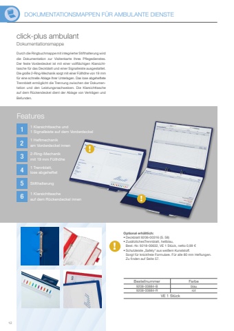 DOKUMENTATIONSMAPPEN F%u00dcR AMBULANTE DIENSTE12124563!!!Features1 Klarsichttasche und 1 Signalleiste auf dem Vorderdeckel1 Trennblatt, lose abgeheftetStifthalterung1 Klarsichttasche auf dem R%u00fcckendeckel innen1 Heftmechanik am Vorderdeckel innen2-Ring-Mechanik mit 19 mm F%u00fcllh%u00f6heclick-plus ambulantDurch die Ringbuchmappe mit integrierter Stifthalterung wird die Dokumentation zur Visitenkarte Ihres Pflegedienstes. Der feste Vorderdeckel ist mit einer vollfl%u00e4chigen Klarsichttasche f%u00fcr das Deckblatt und einer Signalleiste ausgestattet. Die gro%u00dfe 2-Ring-Mechanik sorgt mit einer F%u00fcllh%u00f6he von 19 mm f%u00fcr eine schnelle Ablage Ihrer Unterlagen. Das lose abgeheftete Trennblatt erm%u00f6glicht die Trennung zwischen der Dokumentation und den Leistungsnachweisen. Die Klarsichttasche auf dem R%u00fcckendeckel dient der Ablage von Vertr%u00e4gen und Befunden.DokumentationsmappeBestellnummer Farbe9208-00884-B blau9208-00884-R rotVE 1 St%u00fcckOptional erh%u00e4ltlich:%u2022 Deckblatt 9206-00316 (S. 58) %u2022 Zus%u00e4tzlichesTrennblatt, hellblau, Best.-Nr. 9218-00632, VE 1 St%u00fcck, netto 0,99 %u20ac%u2022 Schutzleiste %u201eSafety%u201c aus wei%u00dfem Kunststoff. Sorgt f%u00fcr knickfreie Formulare. F%u00fcr alle 80 mm Heftungen.Zu finden auf Seite 57.