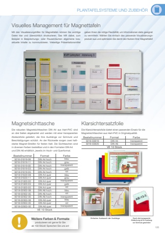 PLANTAFELSYSTEME UND ZUBEH%u00d6R! 125Weitere Farben & Formate produzieren wir gerne f%u00fcr Sie ab 150 St%u00fcck! Sprechen Sie uns an!Bestellnummer Format Farbe9218-03819 DIN A4 transparent9218-03820 DIN A6 transparentVE 10 St%u00fcckVisuelles Management f%u00fcr MagnettafelnMit den Visualisierungshilfen f%u00fcr Magnettafeln k%u00f6nnen Sie wichtigeDaten klar und %u00fcbersichtlich strukturieren. Das hilft dabei, zum Beispiel in Besprechungs- oder Pausenr%u00e4umen allgemeine bzw. aktuelle Inhalte zu kommunizieren. Vielseitige Pr%u00e4sentationsmittel geben Ihnen die n%u00f6tige Flexibilit%u00e4t, um Informationen stets geeignet zu vermitteln. W%u00e4hlen Sie einfach das passende Visualisierungsprodukt aus und optimieren Sie damit den Nutzen Ihrer Magnettafel!Bestellnummer Format Farbe9218-01819-08 DIN A4 hoch blau9218-01819-11 DIN A4 hoch grau9218-01819-00 DIN A4 hoch transparent9218-01819-03 DIN A4 hoch gelb9218-01819-05 DIN A4 hoch rot9218-01820-08 DIN A4 quer blau9218-01820-11 DIN A4 quer grau9218-01820-00 DIN A4 quer transparent9218-01820-03 DIN A4 quer gelb9218-01820-05 DIN A4 quer rot9218-02952-08 DIN A6 hoch blau9218-02952-05 DIN A6 hoch rot9218-02952-00 DIN A6 hoch transparent9218-02953-08 DIN A6 quer blau9218-02953-05 DIN A6 quer rot9218-02953-00 DIN A6 quer transparentVE 10 St%u00fcckDie robusten Magnetsichttaschen DIN A4 aus Hart-PVC sind an drei Seiten abgekantet und werden mit einer transparenten Abdeckfolie geliefert, die Ihre Aush%u00e4nge vor Schmutz und Besch%u00e4digungen sch%u00fctzt. An der R%u00fcckseite sorgen zwei haftstarke Magnet-Streifen f%u00fcr festen Halt. Die Sichttaschen sind in diversen Farben bestellbar und in den Formaten DIN A4 und DIN A6 erh%u00e4ltlich, jeweils im Hoch- und Querformat.Magnetsichttasche KlarsichtersatzfolieDie Klarsichtersatzfolie bietet einen passenden Ersatz f%u00fcr die Magnetsichttaschen aus Hart-PVC in Originalqualit%u00e4t. Einfacher Austausch der Aush%u00e4nge Durch die transparente Abdeckung ist Ihr Aushang vor Schmutz gesch%u00fctzt