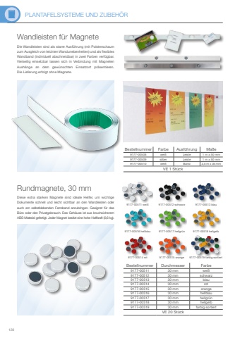 PLANTAFELSYSTEME UND ZUBEH%u00d6R1289177-00511 wei%u00df 9177-00512 schwarz 9177-00513 blau9177-00514 rot 9177-00515 orange 9177-00519 farbig sortiert9177-00516 hellblau 9177-00517 hellgr%u00fcn 9177-00518 hellgelbDie Wandleisten sind als starre Ausf%u00fchrung (mit Polsterschaum zum Ausgleich von leichten Wandunebenheiten) und als flexibles Wandband (individuell abschneidbar) in zwei Farben verf%u00fcgbar. Vielseitig einsetzbar lassen sich in Verbindung mit Magneten Aush%u00e4nge an dem gew%u00fcnschten Einsatzort pr%u00e4sentieren.Die Lieferung erfolgt ohne Magnete. Diese extra starken Magnete sind ideale Helfer, um wichtige Dokumente schnell und leicht sichtbar an den Wandleisten oder auch am selbstklebenden Ferroband anzubringen. Geeignet f%u00fcr das B%u00fcro oder den Privatgebrauch. Das Geh%u00e4use ist aus bruchsicherem ABS-Material gefertigt. Jeder Magnet besitzt eine hohe Haftkraft (0,6 kg).Bestellnummer Durchmesser Farbe9177-00511 30 mm wei%u00df9177-00512 30 mm schwarz9177-00513 30 mm blau9177-00514 30 mm rot9177-00515 30 mm orange9177-00516 30 mm hellblau9177-00517 30 mm hellgr%u00fcn9177-00518 30 mm hellgelb9177-00519 30 mm farbig sortiertVE 20 St%u00fcckBestellnummer Farbe Ausf%u00fchrung Ma%u00dfe9177-00508 wei%u00df Leiste 1 m x 50 mm9177-00509 silber Leiste 1 m x 50 mm9177-00510 wei%u00df Band 2,5 m x 35 mmVE 1 St%u00fcckWandleisten f%u00fcr MagneteRundmagnete, 30 mm