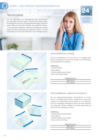 B%u00dcRO- UND VERWALTUNGSORGANISATION13024-STUNDENBESTELLM%u00d6GLICHKEITIM ONLINESHOP:shop.boi.deTerminzettelTerminzettelbl%u00f6cke, einseitigMit den Terminbl%u00f6cken im Format DIN A7 zur Vergabe eines Termins erm%u00f6glichen wir Ihnen eine schnelle und %u00fcbersichtliche Terminvergabe f%u00fcr Ihre Patienten.Ausf%u00fchrung:%u2022 Umfang 50 Blatt %u2022 Oben geleimt%u2022 R%u00fcckenverst%u00e4rkung aus Pappe%u2022 Druck auf 80 g/qm PapierTerminzettelbl%u00f6cke, selbstdurchschreibendMit den selbstdurchschreibenden Terminbl%u00f6cken im Format DIN A7 zur Vergabe eines Termins erm%u00f6glichen wir Ihnen eine schnelle und %u00fcbersichtliche Terminvergabe f%u00fcr Ihre Patienten. Durch die zweiseitige Ausfertigung k%u00f6nnen Sie Ihrem Patienten die individuellen Termine mitgeben und haben gleichzeitig alle Termine f%u00fcr Ihre Unterlagen zur Hand.Ausf%u00fchrung:%u2022 Umfang 50 Durchschreibes%u00e4tze %u2022 Oben geleimt%u2022 R%u00fcckenverst%u00e4rkung aus Pappe%u2022 Druck auf 80 g/qm PapierBestellnummer8909-10210VE 5 St%u00fcckBestellnummer8909-10211VE 5 St%u00fcckF%u00fcr die Organisation und Strukturierung Ihres Terminwesens sind die beiden Varianten unserer Terminzettel die idealen Helfer.Zuverl%u00e4ssig erinnern sie an vereinbarte Behandlungen, Gespr%u00e4che sowie Treffen und sind Ihren Patienten eine gedankliche St%u00fctze. In der ebenfalls erh%u00e4ltlichen selbstdurchschreibenden Variante haben Sie einen Durchschlag der gesamten Termine zur Hand und k%u00f6nnen ihn so f%u00fcr mehr %u00dcbersicht zu den Unterlagen geben.