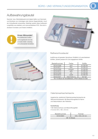 B%u00dcRO- UND VERWALTUNGSORGANISATION131!Unser Allrounder!Die praktischen Aufbewahrungsbeutel sind als schnelle Helfer vielseitig und unkompliziert einsetzbar.PatientenwertsachentascheHygienische, praktische Patientenwertsachentasche als Gleitverschlussbeutel. Mit Beschriftungsfeld f%u00fcr Name und Geburtsdatum des Patienten.Ausstattung:%u2022 Mit Gleitverschluss und Beschriftungsfeld%u2022 Format 240 x 185 x 30 mmRei%u00dfverschlussbeutelAusf%u00fchrung mit geradem Verschluss. Erh%u00e4ltlich in 6 verschiedenen Gr%u00f6%u00dfen, jeweils passend f%u00fcr die angegebene Gr%u00f6%u00dfe. Bestellnummer Farbe Gr%u00f6%u00dfe9218-01038 gr%u00fcn f%u00fcr DIN B49218-03271 blau f%u00fcr DIN A49218-01039 schwarz f%u00fcr DIN B59218-03272 gelb f%u00fcr DIN A59218-01040 rot f%u00fcr DIN B69218-03273 violett f%u00fcr DIN A69218-01041 Jede Farbe 1x 6er SetVE 10 St%u00fcck f%u00fcr Einzelfarben, VPE 6 St%u00fcck im SetBestellnummer Format9318-00061 240 x 185 x 30 mmVE 10 St%u00fcckSammel- bzw. Kleinteilebeutel sind ideale Helfer zum Sammeln und Sortieren von Unterlagen oder kleinen Gegenst%u00e4nden. Auch als Umlaufbeutel verwendbar. Gefertigt werden diese Aufbewahrungshilfen aus stabilem und nylonverst%u00e4rktem PVC. Sie sind in diversen Formaten und Farben erh%u00e4ltlich.Aufbewahrungsbeutel