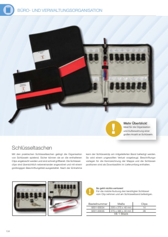 B%u00dcRO- UND VERWALTUNGSORGANISATION134! Mehr %u00dcberblick!Ideal f%u00fcr die Organisation und Aufbewahrung einer gro%u00dfen Anzahl an Schl%u00fcsseln.Bestellnummer Ma%u00dfe Clips9201-00034 220 x 275 x 40 mm 149201-00035 275 x 385 x 40 mm 28VE 1 St%u00fcckMit den praktischen Schl%u00fcsseltaschen gelingt die Organisation von Schl%u00fcsseln spielend. Sicher k%u00f6nnen sie an die enthaltenen Clips angebracht werden und sind schnell griffbereit. Die Schl%u00fcsselclips sind %u00fcbersichtlich nebeneinander angeordnet und mit einem gro%u00dfz%u00fcgigen Beschriftungsfeld ausgestattet. Nach der Entnahme kann der Schl%u00fcsselclip am mitgelieferten Band befestigt werden. So wird einem ungewollten Verlust vorgebeugt. Beschriftungsvorlagen f%u00fcr die Kennzeichnung der Mappe und die Schl%u00fcsselpositionen sind als Downloadlink im Lieferumfang enthalten.So geht nichts verloren!F%u00fcr die mobile Nutzung den ben%u00f6tigten Schl%u00fcssel ! vom Clip nehmen und am Schl%u00fcsselband befestigen.Schl%u00fcsseltaschen