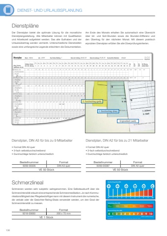 DIENST- UND URLAUBSPLANUNG136Verbale Rating Skala (VRS)Numerische Rating Skala (NRS)0 1 2 3 4 5 6 7 8 9 10 Kein SchmerzKein SchmerzLeichter SchmerzM%u00e4ssiger SchmerzStarker SchmerzSehr starkeSchmerzenUnertr%u00e4glicheSchmerzenSt%u00e4rkster vorstellbarer SchmerzGesichter Rating Skala (GRS)0 1 2 3 4 5 6 7 8 9 10%u00a9 2011 BOI-DOKUTECH GmbH - Coburg - Nachdruck verboten - Bestell-Tel.: 09561/2707 24 %u00b7 Bestell-Fax: 09561/2707 29 %u00b7 www.boi.de %u00b7 Best.-Nr.: 9218-00693Verbale Rating Skala (VRS)Numerische Rating Skala (NRS)0 1 2 3 4 5 6 7 8 9 10 Kein SchmerzKein SchmerzLeichter SchmerzM%u00e4ssiger SchmerzStarker SchmerzSehr starkeSchmerzenUnertr%u00e4glicheSchmerzenSt%u00e4rkster vorstellbarer SchmerzGesichter Rating Skala (GRS)%u00a9 2011 BOI-DOKUTECH GmbH - Coburg - Nachdruck verboten - Bestell-Tel.: 09561/2707 24 %u00b7 Bestell-Fax: 09561/2707 29 %u00b7 www.boi.de %u00b7 Best.-Nr.: 9218-006932. Durchschlag (gelb)1. Durchschlag (blau)Originalblatt (wei%u00df)Der Dienstplan bietet die optimale L%u00f6sung f%u00fcr die monatliche Dienstplangestaltung. Alle Mitarbeiter k%u00f6nnen mit Qualifikation und Arbeitszeit aufgelistet werden. Das alte Guthaben und der Urlaubs%u00fcbertrag werden vermerkt. Unterschiedliche Dienstzeiten sowie eine umfangreiche Legende erleichtern die Dokumentation. Am Ende des Monats erhalten Sie automatisch eine %u00dcbersicht %u00fcber Ist- und Soll-Stunden sowie die Stunden-Differenz und den %u00dcbertrag f%u00fcr den n%u00e4chsten Monat. Mit diesem praktisch erprobten Dienstplan erf%u00fcllen Sie alle %u00dcberpr%u00fcfungskriterien.Bestellnummer Format9206-00326 DIN A3 querVE 50 St%u00fcckBestellnummer Format9206-00387 DIN A2 querVE 50 St%u00fcckDienstplan, DIN A3 f%u00fcr bis zu 9 Mitarbeiter%u2022 Format DIN A3 quer%u2022 3-fach selbstdurchschreibend%u2022 Durchschl%u00e4ge farblich unterschiedlichDienstplan, DIN A2 f%u00fcr bis zu 21 Mitarbeiter%u2022 Format DIN A2 quer%u2022 3-fach selbstdurchschreibend%u2022 Durchschl%u00e4ge farblich unterschiedlichDienstpl%u00e4neSchmerzlinealBestellnummer Format9218-00693 200 x 75 mmVE 1 St%u00fcckSchmerzen werden sehr subjektiv wahrgenommen. Eine Selbstauskunft %u00fcber die Schmerzintensit%u00e4t erlaubt eine entsprechende Schmerzmedikation. Je nach Kommunikationsf%u00e4higkeit des Pflegebed%u00fcrftigen kann mit diesem Instrument die numerische, die verbale oder die Gesichter-Rating-Skala verwendet werden, um den Grad der Schmerzintensit%u00e4t zu messen.