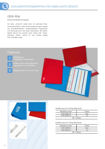 DOKUMENTATIONSMAPPEN F%u00dcR AMBULANTE DIENSTE14123click-lineDie Serie %u201eclick-line%u201c bietet Ihnen ein optimales PreisLeistungsverh%u00e4ltnis. Diese Dokumentationsmappe besteht aus umweltfreundlichem, strapazierf%u00e4higem Polypropylen und %u00fcberzeugt durch eine lange Lebensdauer. Bei diesem Modell k%u00f6nnen Sie zwischen einer 2-Ring oder 4-RingMechanik w%u00e4hlen, welche f%u00fcr eine sichere Ablage Ihrer Unterlagen sorgt.DokumentationsmappeBestellnummer Farbe9109-00024-B blau9109-00024-R rotVE 1 St%u00fcckAusf%u00fchrung mit 2-Ring-MechanikBestellnummer Farbe9109-00003-B blau9109-00003-R rotVE 1 St%u00fcckAusf%u00fchrung mit 4-Ring-MechanikFeaturesGefertigt aus langlebigem Polypropylen2-Ring- oder 4-Ring-Mechanik,mit jeweils 14 mm F%u00fcllh%u00f6heMappenboden mit 30 mm Tiefe