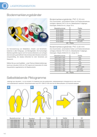 LAGERORGANISATION140A B CGefertigt aus robustem, 1,6 mm dickem PU-Material sind die praktischen, selbstklebenden Piktogramme f%u00fcr den Innenund Au%u00dfenbereich geeignet. Rutschhemmend nach R11 (DIN 51130) sind sie f%u00fcr Betonpflaster und Asphalt geeignet.Bestellnummer Symbol Farbe Ma%u00dfe VE9225-20062-040 F%u00fc%u00dfe (A) gelb 297 x 110 mm 5 Paar9225-20062-070 F%u00fc%u00dfe (A) wei%u00df 297 x 110 mm 5 Paar9225-20072-040 Fu%u00dfg%u00e4nger (B) gelb 600 x 330 mm 1 St%u00fcck9225-20072-070 Fu%u00dfg%u00e4nger (B) wei%u00df 600 x 330 mm 1 St%u00fcck9225-20082-040 Pfeil (C) gelb 145 x 90 mm 10 St%u00fcck9225-20082-070 Pfeil (C) wei%u00df 145 x 90 mm 10 St%u00fcckZur Kennzeichnung von Stellpl%u00e4tzen, Arbeits- und Sicherheitsbereichen in allen Fertigungs- und Montagehallen. Die hochwertigen Markierungshilfen eignen sich f%u00fcr trockene Bereiche und verf%u00fcgen %u00fcber eine sehr gute Haftkraft. Sie sind besonders flexibel und extrem strapazierf%u00e4hig. Ein ideales Hilfsmittel f%u00fcr mehr Sicherheit und %u00dcbersicht.W%u00e4hlen Sie aus zwei Qualit%u00e4ten - unser Premium-Bodenmarkierungsband aus robustem 0,50 mm PVC eignet sich besonders f%u00fcr stark frequentierte Lagerbereiche mit Staplerverkehr.Bodenmarkierungsb%u00e4nder, PVC 0,50 mmZum Zuschneiden, verschiedene Farben und Farbkombinationenverf%u00fcgbar, Material: PVC 0,50 mm, Belastbarkeit: Fu%u00dfg%u00e4nger, Hubwagen, Stapler, Breite 50 mm, L%u00e4nge 33 m.Bestellnummer Farbe9225-20411-010 blau9225-20411-030 gr%u00fcn9225-20411-020 rot9225-20411-070 wei%u00df9225-20411-040 gelb9225-20411-311 schwarz-gelb9225-20411-300 rot-wei%u00df9225-20411-320 gr%u00fcn-wei%u00dfVE 1 RolleBodenmarkierungsb%u00e4nder, PVC 0,16 mmZum Zuschneiden, verschiedene Farben und Farbkombinationen verf%u00fcgbar; Material: PVC 0,16 mm, Belastbarkeit: Fu%u00dfg%u00e4nger, Hubwagen, Breite 50 mm, L%u00e4nge 10 m.Bestellnummer Farbe9218-03056 blau9218-03057 gr%u00fcn9218-03058 rot9218-03059 wei%u00df9218-03060 gelb9218-03061 schwarz-gelb9218-03062 rot-wei%u00dfVE 1 RolleBodenmarkierungsb%u00e4nderSelbstklebende Piktogramme