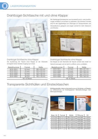 LAGERORGANISATION142Mit Magnetstreifen. Ideal zur Kennzeichnung von Schr%u00e4nken und Regalen zur Aufbewahrung von Arbeitspapieren, Werkstattunterlagen oder Wartungsunterlagen.Best.-Nr. Format Ma%u00dfe %u00d6ffnung VE9218-03050 DIN A3 hoch 436 x 316 mm kurze Seite 10 St%u00fcck9218-03051 DIN A3 quer 316 x 436 mm lange Seite 10 St%u00fcck9218-03052 DIN A4 hoch 310 x 215 mm kurze Seite 50 St%u00fcck9218-03064 DIN A4 quer 215 x 310 mm lange Seite 50 St%u00fcck9218-03053 DIN A5 hoch 215 x 160 mm kurze Seite 50 St%u00fcck9218-03054 DIN A5 quer 155 x 230 mm lange Seite 50 St%u00fcck9218-03055 DIN A7 quer 60 x 110 mm lange Seite 100 St%u00fcckDrahtb%u00fcgel-Sichttasche ohne Klappe Die Ausf%u00fchrung der Tasche ohne Klappe an der Oberseite erm%u00f6glicht einen direkten Zugang zum Inhalt.Drahtb%u00fcgel-Sichttasche ohne Klappe Die Klappe an der Oberseite der Tasche sch%u00fctzt den Inhalt vor Verschmutzungen und ist leicht zu %u00f6ffnen und zu schlie%u00dfen.Die Drahtb%u00fcgel-Sichttaschen aus Kunststoff sind in zwei Ausf%u00fchrungen erh%u00e4ltlich und einfach zu platzieren. Die diversen Formate sind f%u00fcr alle Lagerbelege zum Anbringen an Transportkisten und Versandkartons geeignet und sorgen schnell f%u00fcr mehr %u00dcbersicht und Struktur. Bestellnummer Format Ma%u00dfe9219-10012 A4 hoch 280 x 325 mm9219-10010 A4 quer 330 x 245 mm9219-10008 A5 hoch 220 x 230 mm9219-10006 A5 quer 280 x 180 mm9219-10004 A6 quer 195 x 135 mmVE 10 St%u00fcckBestellnummer Format Ma%u00dfe9219-10011 A4 hoch 280 x 447 mm9219-10009 A4 quer 330 x 325 mm9219-10007 A5 hoch 220 x 320 mm9219-10005 A5 quer 280 x 270 mm9219-10003 A6 quer 195 x 185 mmVE 10 St%u00fcckDrahtb%u00fcgel-Sichttasche mit und ohne KlappeTransparente Sichth%u00fcllen und Einstecktaschen