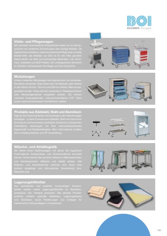 145LagerungshilfmittelAus technischen und qualitativ hochwertigen Schaumstoffen werden unsere Lagerungshilfsmittel zur Dekubitusprophylaxe und -therapie produziert. Das aktuelle Produktportfolio umfasst spezielle Matratzen, Lagerungskissen und Sitzkissen, sowie Polsterungen und Auflagen f%u00fcr medizinische Transportliegen in Ambulanzen.Visite- und PflegewagenMit mehreren verschiedenen Produktlinien bieten wir f%u00fcr alle Anspr%u00fcche von modernen Einrichtungen das richtige Mobiliar. Ob digitale Dokumentation, patientenorientierte Pflege oder schnelle Notfall-Hilfe, das Mobiliar von BOI ist f%u00fcr alle F%u00e4lle ger%u00fcstet. Dabei setzen wir stets auf hochwertige Materialen, z.B. Aluminium, Edelstahl und MDF-Platten. Ein umfangreiches Sortiment an Zubeh%u00f6r individualisiert die Wagen auf Ihre Anspr%u00fcche.W%u00e4sche- und AbfalllogistikWir bieten Ihnen Stationswagen, mit denen Sie hygienischFrischw%u00e4sche transportieren und Schmutzw%u00e4sche sammelnk%u00f6nnen. Ferner k%u00f6nnen Sie aus einer Vielzahl an W%u00e4schesammlern und Kombisammlern (W%u00e4sche und Abfall) w%u00e4hlen. Alle W%u00e4sche- und Kombisammler zeichnen sich durch eine %u00e4u%u00dferst langlebige und st%u00f6rungsfreie Verarbeitung bzw. Mechanik aus. Produkte aus Edelstahl, Stahl und AluminiumEgal ob Sie Infusionsst%u00e4nder, Servicewagen oder W%u00e4schewagen ben%u00f6tigen %u2013 unsere Produkte aus Edelstahl, Stahl und Aluminium sind robust und hochwertig verarbeitet. Die leicht zu reinigenden Oberfl%u00e4chen %u00fcberzeugen mit ihrer schmutzabweisenden Eigenschaft und Sterilisierf%u00e4higkeit. Mehr Informationen erhalten Sie im Katalog Mobiliar und OP-Ausstattung.ModulwagenUnsere modernen Modulwagen sind ergonomisch und anwenderfreundlich konstruiert. Diese Serie kann mit Modulen oder K%u00f6rben in den H%u00f6hen 50 mm, 100 mm und 200 mm (K%u00f6rbe 180mm) ausgestattet werden. Diese k%u00f6nnen wahlweise in Teleskopschienen oder Modultr%u00e4gerw%u00e4nde eingesetzt werden. Sie k%u00f6nnen zwischen Auszugsblenden, vollumschwenkbaren 270%u00b0 T%u00fcren sowie vollumschwenkbaren Drehfaltt%u00fcren w%u00e4hlen.