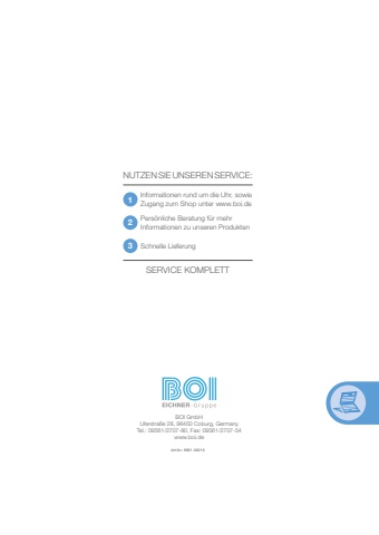 Informationen rund um die Uhr, sowieZugang zum Shop unter www.boi.dePers%u00f6nliche Beratung f%u00fcr mehrInformationen zu unseren ProduktenSchnelle Lieferung123NUTZEN SIE UNSEREN SERVICE:SERVICE KOMPLETTArt.Nr.: 8901-00216BOI GmbHUferstra%u00dfe 28, 96450 Coburg, GermanyTel.: 09561/2707-80, Fax: 09561/2707-54www.boi.de