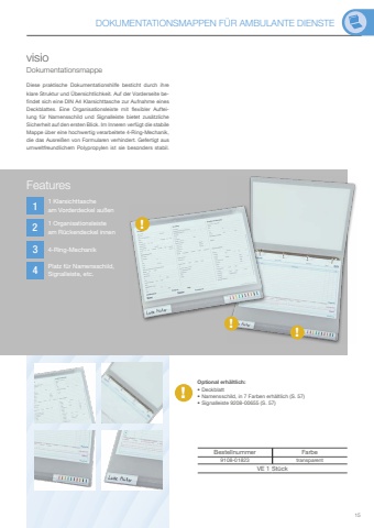 DOKUMENTATIONSMAPPEN F%u00dcR AMBULANTE DIENSTE151234! !!!visioBestellnummer Farbe9108-01823 transparentVE 1 St%u00fcckOptional erh%u00e4ltlich:%u2022 Deckblatt%u2022 Namensschild, in 7 Farben erh%u00e4ltlich (S. 57) %u2022 Signalleiste 9208-00655 (S. 57)Diese praktische Dokumentationshilfe besticht durch ihre klare Struktur und %u00dcbersichtlichkeit. Auf der Vorderseite befindet sich eine DIN A4 Klarsichttasche zur Aufnahme eines Deckblattes. Eine Organisationsleiste mit flexibler Aufteilung f%u00fcr Namensschild und Signalleiste bietet zus%u00e4tzliche Sicherheit auf den ersten Blick. Im Inneren verf%u00fcgt die stabile Mappe %u00fcber eine hochwertig verarbeitete 4-Ring-Mechanik, die das Ausrei%u00dfen von Formularen verhindert. Gefertigt aus umweltfreundlichem Polypropylen ist sie besonders stabil.Dokumentationsmappe1 Klarsichttasche am Vorderdeckel au%u00dfen1 Organisationsleiste am R%u00fcckendeckel innen4-Ring-MechanikPlatz f%u00fcr Namensschild, Signalleiste, etc.Features