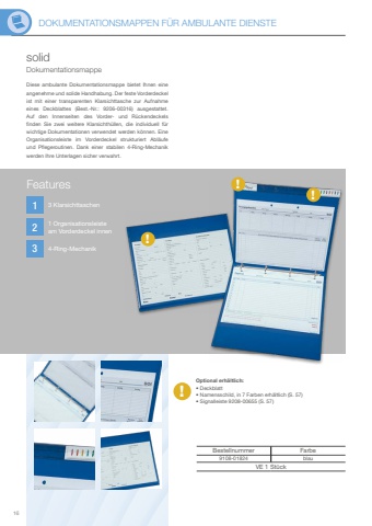 DOKUMENTATIONSMAPPEN F%u00dcR AMBULANTE DIENSTE16123!!!!solidBestellnummer Farbe9108-01824 blauVE 1 St%u00fcckDiese ambulante Dokumentationsmappe bietet Ihnen eine angenehme und solide Handhabung. Der feste Vorderdeckel ist mit einer transparenten Klarsichttasche zur Aufnahme eines Deckblattes (Best.-Nr.: 9206-00316) ausgestattet. Auf den Innenseiten des Vorder- und R%u00fcckendeckels finden Sie zwei weitere Klarsichth%u00fcllen, die individuell f%u00fcr wichtige Dokumentationen verwendet werden k%u00f6nnen. Eine Organisationsleiste im Vorderdeckel strukturiert Abl%u00e4ufe und Pflegeroutinen. Dank einer stabilen 4-Ring-Mechanik werden Ihre Unterlagen sicher verwahrt.DokumentationsmappeOptional erh%u00e4ltlich:%u2022 Deckblatt%u2022 Namensschild, in 7 Farben erh%u00e4ltlich (S. 57) %u2022 Signalleiste 9208-00655 (S. 57)Features3 Klarsichttaschen1 Organisationsleiste am Vorderdeckel innen4-Ring-Mechanik