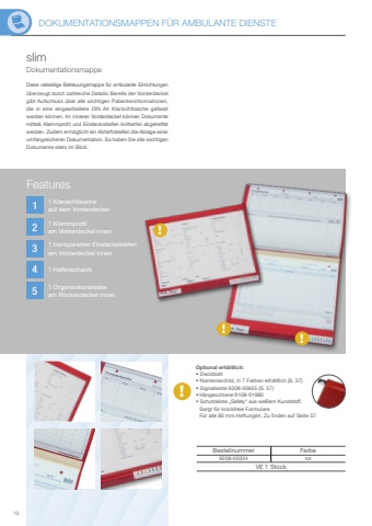 DOKUMENTATIONSMAPPEN F%u00dcR AMBULANTE DIENSTE1812345!!!!Features1 Klarsichttasche auf dem Vorderdeckel 1 Klemmprofil am Vorderdeckel innen1 transparenter Einsteckstreifen am Vorderdeckel innen1 Heftmechanik1 Organisationsleiste am R%u00fcckendeckel innenslimBestellnummer Farbe9208-00324 rotVE 1 St%u00fcckDiese vielseitige Betreuungsmappe f%u00fcr ambulante Einrichtungen%u00fcberzeugt durch zahlreiche Details: Bereits der Vorderdeckel gibt Aufschluss %u00fcber alle wichtigen Patienteninformationen, die in eine eingearbeitete DIN A4 Klarsichttasche gefasst werden k%u00f6nnen. Im inneren Vorderdeckel k%u00f6nnen Dokumente mittels Klemmprofil und Einsteckstreifen knitterfrei abgeheftet werden. Zudem erm%u00f6glicht ein Abheftstreifen die Ablage einer umfangreicheren Dokumentation. So haben Sie alle wichtigen Dokumente stets im Blick. DokumentationsmappeOptional erh%u00e4ltlich:%u2022 Deckblatt%u2022 Namensschild, in 7 Farben erh%u00e4ltlich (S. 57) %u2022 Signalleiste 9208-00655 (S. 57)%u2022 H%u00e4ngeschiene 9108-01980%u2022 Schutzleiste %u201eSafety%u201c aus wei%u00dfem Kunststoff. Sorgt f%u00fcr knickfreie Formulare. F%u00fcr alle 80 mm Heftungen. Zu finden auf Seite 57.