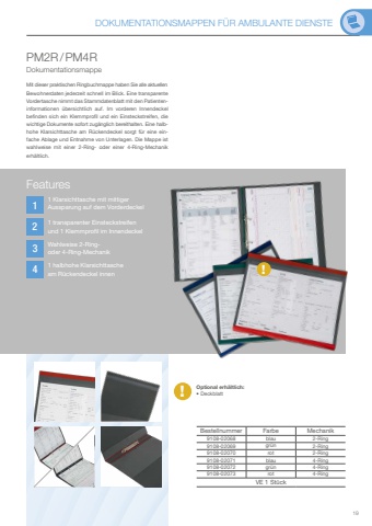 DOKUMENTATIONSMAPPEN F%u00dcR AMBULANTE DIENSTE191234!!1 Klarsichttasche mit mittiger Aussparung auf dem Vorderdeckel1 transparenter Einsteckstreifen und 1 Klemmprofil im InnendeckelWahlweise 2-Ringoder 4-Ring-Mechanik1 halbhohe Klarsichttasche am R%u00fcckendeckel innenFeaturesPM2R/PM4RMit dieser praktischen Ringbuchmappe haben Sie alle aktuellenBewohnerdaten jederzeit schnell im Blick. Eine transparente Vordertasche nimmt das Stammdatenblatt mit den Patienteninformationen %u00fcbersichtlich auf. Im vorderen Innendeckel befinden sich ein Klemmprofil und ein Einsteckstreifen, die wichtige Dokumente sofort zug%u00e4nglich bereithalten. Eine halbhohe Klarsichttasche am R%u00fcckendeckel sorgt f%u00fcr eine einfache Ablage und Entnahme von Unterlagen. Die Mappe ist wahlweise mit einer 2-Ring- oder einer 4-Ring-Mechanik erh%u00e4ltlich.DokumentationsmappeOptional erh%u00e4ltlich:%u2022 DeckblattBestellnummer Farbe Mechanik9108-02068 blau 2-Ring9108-02069 gr%u00fcn 2-Ring9108-02070 rot 2-Ring9108-02071 blau 4-Ring9108-02072 gr%u00fcn 4-Ring9108-02073 rot 4-RingVE 1 St%u00fcck