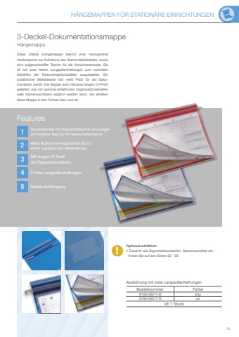H%u00c4NGEMAPPEN F%u00dcR STATION%u00c4RE EINRICHTUNGEN2145123!Features3-Deckel-DokumentationsmappeDiese stabile H%u00e4ngemappe besitzt eine transparente Vordertasche zur Aufnahme des Stammdatenblattes, sowie eine aufgeschwei%u00dfte Tasche f%u00fcr die Versichertenkarte. Sie ist mit zwei festen Langau%u00dfenheftungen zum schnellen Abheften der Dokumentationsbl%u00e4tter ausgestattet. Ein zus%u00e4tzlicher Mitteldeckel h%u00e4lt mehr Platz f%u00fcr die Dokumentation bereit. Die Mappe wird inklusive langem C-Profil geliefert, das mit optional erh%u00e4ltlichen Organisationsstreifen oder Namensschildern erg%u00e4nzt werden kann. Sie erhalten diese Mappe in den Farben blau und rot.H%u00e4ngemappeOptional erh%u00e4ltlich:%u2022 Zubeh%u00f6r wie Organisationsstreifen, Namensschilder etc.finden Sie auf den Seiten 56 - 59.Bestellnummer Farbe9109-00017-B blau9109-00017-R rotVE 1 St%u00fcckAusf%u00fchrung mit zwei Langau%u00dfenheftungenVorderdeckel mit Klarsichttasche und aufgeschwei%u00dfter Tasche f%u00fcr VersichertenkarteMehr Aufnahmem%u00f6glichkeit durch einen zus%u00e4tzlichen MitteldeckelMit langem C-Profilals Organisationsleiste2 feste Langau%u00dfenheftungenStabile Aufh%u00e4ngung
