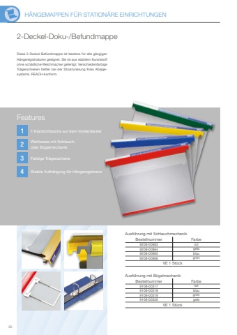 H%u00c4NGEMAPPEN F%u00dcR STATION%u00c4RE EINRICHTUNGEN301234FeaturesWahlweise mit Schlauchoder B%u00fcgelmechanikStabile Aufh%u00e4ngung f%u00fcr H%u00e4ngeregistratur2-Deckel-Doku-/BefundmappeDiese 2-Deckel Befundmappe ist bestens f%u00fcr alle g%u00e4ngigen H%u00e4ngeregistraturen geeignet. Sie ist aus stabilem Kunststoff ohne sch%u00e4dliche Weichmacher gefertigt. Verschiedenfarbige Tr%u00e4gerschienen helfen bei der Strukturierung Ihres Ablagesystems. REACH-konform.1 Klarsichttasche auf dem VorderdeckelFarbige Tr%u00e4gerschieneBestellnummer Farbe9208-00863 rot9208-00864 gelb9208-00865 blau9208-00866 gr%u00fcnVE 1 St%u00fcckAusf%u00fchrung mit SchlauchmechanikBestellnummer Farbe9108-00317 rot9108-00318 blau9108-00319 gr%u00fcn9108-00320 gelbVE 1 St%u00fcckAusf%u00fchrung mit B%u00fcgelmechanik