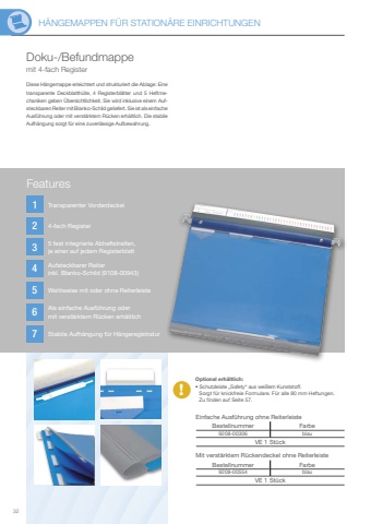 H%u00c4NGEMAPPEN F%u00dcR STATION%u00c4RE EINRICHTUNGEN321234567!Features4-fach RegisterAufsteckbarer Reiter inkl. Blanko-Schild (9108-00943)Wahlweise mit oder ohne ReiterleisteAls einfache Ausf%u00fchrung oder mit verst%u00e4rktem R%u00fccken erh%u00e4ltlichStabile Aufh%u00e4ngung f%u00fcr H%u00e4ngeregistraturDoku-/Befundmappe Diese H%u00e4ngemappe erleichtert und strukturiert die Ablage: Eine transparente Deckblatth%u00fclle, 4 Registerbl%u00e4tter und 5 Heftmechaniken geben %u00dcbersichtlichkeit. Sie wird inklusive einem Aufsteckbaren Reiter mit Blanko-Schild geliefert. Sie ist als einfache Ausf%u00fchrung oder mit verst%u00e4rktem R%u00fccken erh%u00e4ltlich. Die stabile Aufh%u00e4ngung sorgt f%u00fcr eine zuverl%u00e4ssige Aufbewahrung.Transparenter Vorderdeckel5 fest integrierte Abheftstreifen, je einer auf jedem Registerblattmit 4-fach RegisterOptional erh%u00e4ltlich:%u2022 Schutzleiste %u201eSafety%u201c aus wei%u00dfem Kunststoff. Sorgt f%u00fcr knickfreie Formulare. F%u00fcr alle 80 mm Heftungen. Zu finden auf Seite 57.Bestellnummer Farbe9208-00306 blauVE 1 St%u00fcckEinfache Ausf%u00fchrung ohne ReiterleisteBestellnummer Farbe9208-00554 blauVE 1 St%u00fcckMit verst%u00e4rktem R%u00fcckendeckel ohne Reiterleiste