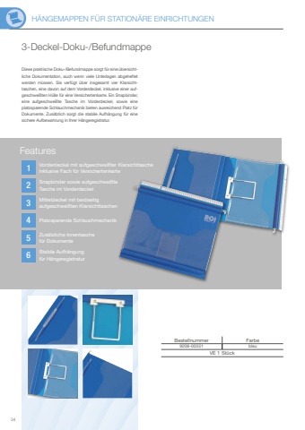 H%u00c4NGEMAPPEN F%u00dcR STATION%u00c4RE EINRICHTUNGEN341234563-Deckel-Doku-/BefundmappeDiese praktische Doku-/Befundmappe sorgt f%u00fcr eine %u00fcbersichtliche Dokumentation, auch wenn viele Unterlagen abgeheftet werden m%u00fcssen. Sie verf%u00fcgt %u00fcber insgesamt vier Klarsichttaschen, eine davon auf dem Vorderdeckel, inklusive einer aufgeschwei%u00dften H%u00fclle f%u00fcr eine Versichertenkarte. Ein Snapbinder, eine aufgeschwei%u00dfte Tasche im Vorderdeckel, sowie eine platzsparende Schlauchmechanik bieten ausreichend Platz f%u00fcr Dokumente. Zus%u00e4tzlich sorgt die stabile Aufh%u00e4ngung f%u00fcr eine sichere Aufbewahrung in Ihrer H%u00e4ngeregistratur.Bestellnummer Farbe9208-00351 blauVE 1 St%u00fcckFeaturesSnapbinder sowie aufgeschwei%u00dfte Tasche im VorderdeckelPlatzsparende SchlauchmechanikZus%u00e4tzliche Innentaschef%u00fcr DokumenteStabile Aufh%u00e4ngung f%u00fcr H%u00e4ngeregistraturVorderdeckel mit aufgeschwei%u00dfter Klarsichttasche inklusive Fach f%u00fcr VersichertenkarteMitteldeckel mit beidseitig aufgeschwei%u00dften Klarsichttaschen