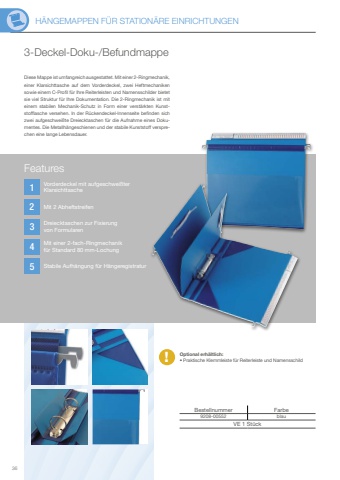 H%u00c4NGEMAPPEN F%u00dcR STATION%u00c4RE EINRICHTUNGEN3612345!Vorderdeckel mit aufgeschwei%u00dfter KlarsichttascheMit 2 AbheftstreifenDreiecktaschen zur Fixierungvon FormularenMit einer 2-fach-Ringmechanikf%u00fcr Standard 80 mm-LochungStabile Aufh%u00e4ngung f%u00fcr H%u00e4ngeregistraturFeatures3-Deckel-Doku-/BefundmappeDiese Mappe ist umfangreich ausgestattet. Mit einer 2-Ringmechanik, einer Klarsichttasche auf dem Vorderdeckel, zwei Heftmechaniken sowie einem C-Profil f%u00fcr Ihre Reiterleisten und Namensschilder bietet sie viel Struktur f%u00fcr Ihre Dokumentation. Die 2-Ringmechanik ist mit einem stabilen Mechanik-Schutz in Form einer verst%u00e4rkten Kunststofflasche versehen. In der R%u00fcckendeckel-Innenseite befinden sich zwei aufgeschwei%u00dfte Dreiecktaschen f%u00fcr die Aufnahme eines Dokumentes. Die Metallh%u00e4ngeschienen und der stabile Kunststoff versprechen eine lange Lebensdauer. Bestellnummer Farbe9208-00552 blauVE 1 St%u00fcckOptional erh%u00e4ltlich:%u2022 Praktische Klemmleiste f%u00fcr Reiterleiste und Namensschild
