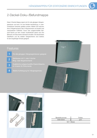 H%u00c4NGEMAPPEN F%u00dcR STATION%u00c4RE EINRICHTUNGEN3912342-Deckel-Doku-/BefundmappeDiese 2-Deckel-Mappe eignet sich f%u00fcr alle g%u00e4ngigen H%u00e4ngeregistraturen und kann, f%u00fcr eine flexible Handhabung, in unterschiedlichen Varianten geliefert werden: W%u00e4hlen Sie zwischen einer 2-B%u00fcgelmechanik oder 2-Ringmechanik und jeweils zwei verschiedenen F%u00fcllh%u00f6hen. Durch eine aufgeschwei%u00dfte Klarsicht-Tasche auf dem inneren Vorderdeckel lassen sich Ihre Befunde und Dokumente individuell verwalten. Die abwischbare Oberfl%u00e4che und die stabilen H%u00e4ngeschienen sind bestens f%u00fcr den langfristigen Einsatz geeignet.Bestellnummer Farbe9208-00342 gr%u00fcnVE 1 St%u00fcckFeaturesWahlweise mit 2- oder 4-facher Ring- oder B%u00fcgelmechanikStabile Aufh%u00e4ngung f%u00fcr H%u00e4ngeregistraturF%u00fcr alle g%u00e4ngigen H%u00e4ngeregistraturen geeignetZus%u00e4tzliche aufgeschwei%u00dfte Klarsichttascheim Inneren f%u00fcr Dokumente