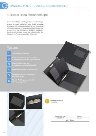 H%u00c4NGEMAPPEN F%u00dcR STATION%u00c4RE EINRICHTUNGEN421234563-Deckel-Doku-/BefundmappeDiese 3-Deckel-Mappe mit 2-Ringmechanik und Metallh%u00e4ngeschienen ist stabil, abwischbar sowie flexibel einsetzbar. So erleichtern Sie Ihre Dokumentation! Auf dem Vorderdeckel befinden sich au%u00dfen eine Klarsichttasche f%u00fcr die Gesundheitskarte und innen eine Zettelklammer. Die Mittel- und R%u00fcckendeckelinnenseite besitzen jeweils eine aufgeschwei%u00dfte Klarsichttasche zur Aufnahme zus%u00e4tzlicher Dokumente.Optional erh%u00e4ltlich:%u2022 DeckblattBestellnummer Farbe9208-00407 schwarzVE 1 St%u00fcckFeaturesVorderdeckel mit aufgeschwei%u00dfter Klarsichttasche f%u00fcr VersicherungskarteMit Federmechanik im InnendeckelMit einer 2-fach-Ringmechanik,F%u00fcllh%u00f6he 14 mmStabile Aufh%u00e4ngung aus Metallf%u00fcr H%u00e4ngeregistraturSehr flexibel einsetzbarKlarsichttasche auf dem Innendeckel sowie R%u00fcckendeckel!