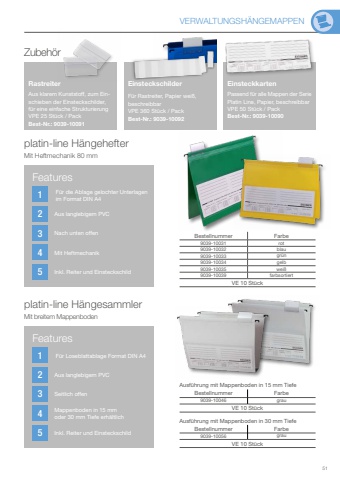 VERWALTUNGSH%u00c4NGEMAPPEN511234512345Aus klarem Kunststoff, zum Einschieben der Einsteckschilder, f%u00fcr eine einfache Strukturierung VPE 25 St%u00fcck / PackBest-Nr.: 9039-10091Rastreiterplatin-line H%u00e4ngehefterMit Heftmechanik 80 mmplatin-line H%u00e4ngesammlerMit breitem MappenbodenBestellnummer Farbe9039-10031 rot9039-10032 blau9039-10033 gr%u00fcn9039-10034 gelb9039-10035 wei%u00df9039-10039 farbsortiertVE 10 St%u00fcckBestellnummer Farbe9039-10046 grauVE 10 St%u00fcckAusf%u00fchrung mit Mappenboden in 15 mm TiefeBestellnummer Farbe9039-10056 grauVE 10 St%u00fcckAusf%u00fchrung mit Mappenboden in 30 mm TiefeF%u00fcr die Ablage gelochter Unterlagen im Format DIN A4Aus langlebigem PVCNach unten offenMit HeftmechanikInkl. Reiter und EinsteckschildFeaturesF%u00fcr Loseblattablage Format DIN A4 Aus langlebigem PVCSeitlich offenMappenboden in 15 mm oder 30 mm Tiefe erh%u00e4ltlichInkl. Reiter und EinsteckschildFeaturesZubeh%u00f6rPassend f%u00fcr alle Mappen der Serie Platin Line, Papier, beschreibbar VPE 50 St%u00fcck / PackBest-Nr.: 9039-10090F%u00fcr Rastreiter, Papier wei%u00df, beschreibbarVPE 360 St%u00fcck / PackBest-Nr.: 9039-10092Einsteckschilder Einsteckkarten