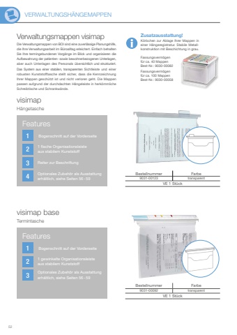 VERWALTUNGSH%u00c4NGEMAPPEN521234123Zusatzausstattung!K%u00f6rbchen zur Ablage Ihrer Mappen in einer H%u00e4ngeregistratur. Stabile Metallkonstruktion mit Beschichtung in grau. Verwaltungsmappen visimapBestellnummer Farbe9031-00123 transparentVE 1 St%u00fcckBestellnummer Farbe9031-00092 transparentVE 1 St%u00fcckDie Verwaltungsmappen von BOI sind eine zuverl%u00e4ssige Planungshilfe, die Ihre Verwaltungsarbeit im B%u00fcroalltag erleichert. Einfach behalten Sie Ihre termingebundenen Vorg%u00e4nge im Blick und organisieren dieAufbewahrung der patienten- sowie bewohnerbezogenen Unterlagen, aber auch Unterlagen des Personals %u00fcbersichtlich und strukturiert. Das System aus einer stabilen, transparenten Sichtleiste und einer robusten Kunststofftasche stellt sicher, dass die Kennzeichnung Ihrer Mappen gesch%u00fctzt ist und nicht verloren geht. Die Mappen passen aufgrund der durchdachten H%u00e4ngeleiste in herk%u00f6mmliche Schreibtische und Schrankw%u00e4nde.visimapH%u00e4ngetascheFassungsverm%u00f6gen f%u00fcr ca. 40 MappenBest-Nr.: 9030-00082Fassungsverm%u00f6gen f%u00fcr ca. 100 MappenBest-Nr.: 9030-00058Bogenschnitt auf der Vorderseite1 flache Organisationsleiste aus stabilem KunststoffReiter zur BeschriftungOptionales Zubeh%u00f6r als Ausstattung erh%u00e4ltlich, siehe Seiten 56-59FeaturesBogenschnitt auf der Vorderseite1 gewinkelte Organisationsleiste aus stabilem KunststoffOptionales Zubeh%u00f6r als Ausstattung erh%u00e4ltlich, siehe Seiten 56-59Featuresvisimap baseTermintasche