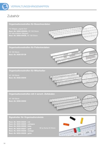 VERWALTUNGSH%u00c4NGEMAPPEN56Organisationsstreifen f%u00fcr BewohnerdatenF%u00fcr Mappe %u201esignal-line%u201c Best.-Nr. 9206-00025A, VE 100 St%u00fcckF%u00fcr alle anderen Mappen Best.-Nr. 9206-00438, VE 100 St%u00fcckOrganisationsstreifen f%u00fcr PatientendatenVE 100 St%u00fcckBest.-Nr. 9036-00139Organisationsstreifen f%u00fcr MitarbeiterVE 100 St%u00fcckBest.-Nr. 9036-00040Organisationsstreifen mit 4 versch. ZeitskalenVE 100 St%u00fcckBest.-Nr. 9036-00052Signalreiter f%u00fcr OrganisationsleisteBest.-Nr. 9035-00224 - rotBest.-Nr. 9035-00225 - schwarzBest.-Nr. 9035-00226 - blauBest.-Nr. 9035-00227 - gelbBest.-Nr. 9035-00228 - orangeBest.-Nr. 9035-00229 - gr%u00fcnVE je Sorte 20 St%u00fcckZubeh%u00f6r