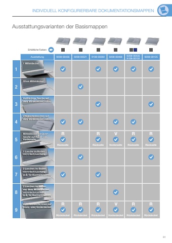INDIVIDUELL KONFIGURIERBARE DOKUMENTATIONSMAPPEN61Ausstattung 9208-00436 9208-00521 9108-00392 9208-00468 9208-004359108-00152 9208-001251234567891 MitteldeckelOhne MitteldeckelVollfl%u00e4chige Tasche auf dem Vorderdeckel au%u00dfenChipkartentaschen auf dem Vorderdeckel au%u00dfenMitteldeckel mit Quertasche auf R%u00fcck- oder Vorderseite1 Lasche im Boden mit 4-fach-Lochung2 Laschen im Boden mit 4-fach-Lochung(z.B. f%u00fcr Buchschrauben)2 Laschen im Boden vor dem Mitteldeckel mit 4-fach-Lochung (z.B. f%u00fcr Buchschrauben)Dehnfalztasche innen auf R%u00fcck- oder VorderdeckelR%u00fcckseiteR%u00fcckdeckelRRR%u00fcckdeckel R%u00fcckdeckel Vorderdeckel R%u00fcckdeckel R%u00fcckdeckelR%u00fcckseite Vorderseite R%u00fcckseite R%u00fcckseiteR R V R RR V R RAusstattungsvarianten der Basismappen Erh%u00e4ltliche Farben