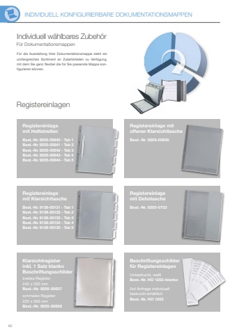 INDIVIDUELL KONFIGURIERBARE DOKUMENTATIONSMAPPEN62Registereinlage mit HeftstreifenBest.-Nr. 9205-00640 - Tab 1Best.-Nr. 9205-00641 - Tab 2Best.-Nr. 9205-00642 - Tab 3Best.-Nr. 9205-00643 - Tab 4Best.-Nr. 9205-00644 - Tab 5Registereinlagemit KlarsichttascheBest.-Nr. 9108-00131 - Tab 1Best.-Nr. 9108-00132 - Tab 2Best.-Nr. 9108-00133 - Tab 3Best.-Nr. 9108-00134 - Tab 4Best.-Nr. 9108-00135 - Tab 5Klarsichtregisterinkl. 1 Satz blanko Beschriftungsschilderbreites Register 245 x 300 mmBest.-Nr. 9205-00637schmales Register 225 x 300 mmBest.-Nr. 9205-00658Registereinlage mit offener KlarsichtlascheBest.-Nr. 9205-00930Registereinlage mit DehntascheBest.-Nr. 9205-0733Beschriftungsschilder f%u00fcr RegistereinlagenUnbedruckt, wei%u00dfBest.-Nr. HO 1203-blankoAuf Anfrage individuell bedruckt erh%u00e4ltlichBest.-Nr. HO 1203F%u00fcr DokumentationsmappenF%u00fcr die Ausstattung Ihrer Dokumentationsmappe steht ein umfangreiches Sortiment an Zubeh%u00f6rteilen zu Verf%u00fcgung, mit dem Sie ganz flexibel die f%u00fcr Sie passende Mappe konfigurieren k%u00f6nnen. Individuell w%u00e4hlbares Zubeh%u00f6rRegistereinlagen