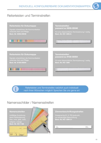 INDIVIDUELL KONFIGURIERBARE DOKUMENTATIONSMAPPEN65Reiterleisten und Terminstreifen nat%u00fcrlich auch individuell nach Ihren W%u00fcnschen m%u00f6glich! Sprechen Sie uns gerne an!Reiterleiste f%u00fcr DokumappeSignale unterst%u00fctzen die Kommunikation zwischen Arzt und Pflege.Best.-Nr. 9208-00048Terminstreifen passend zu 9208-00048F%u00fcr eine %u00fcbersichtliche Terminplanung,1-seitigBest.-Nr. HO 1299-AReiterleiste f%u00fcr DokumappeSignale unterst%u00fctzen die Kommunikation zwischen Arzt und Pflege.Best.-Nr. 9108-00054Terminstreifen passend zu 9108-00054F%u00fcr eine %u00fcbersichtliche Terminplanung,1-seitigBest.-Nr. HO 1299Auff%u00e4llige Zuordnung dank Farbkodierung: blau, rosa, gelb, wei%u00df, hellgr%u00fcn, orangeBest.-Nr. HO 1189Dreisprachig (D, E, FR) bedruckt, zur eindeutigen BeschriftungBest.-Nr. HO 1299-31Reiterleisten und TerminstreifenNamensschilder / NamensstreifenNamensstreifen Zimmerbeschriftungsstreifen