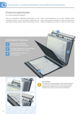 INDIVIDUELL KONFIGURIERBARE DOKUMENTATIONSMAPPEN66123123!Individuelle FeaturesNamensschild, Reiterleiste und Terminstreifen eingezogen5 Einlagen eingehangen mit individuellen Beschriftungsschildern best%u00fccktDrahtb%u00fcgel-Klemm-Mechanikim VorderdeckelBitte beachten:Die individuell zusammengestellten Dokumentationsmappen sind nicht mit Formularen best%u00fcckt. Diese k%u00f6nnen optional bestellt werden. W%u00e4hlen Sie aus unserem umfangreichen Sortiment die Formulare passend f%u00fcr Ihre Bed%u00fcrfnisse.AnwendungsbeispieleF%u00fcr DokumentationsmappenDurch die unterschiedlich ausgestatteten Basismappen und das umfangreiche Zubeh%u00f6r sind viele verschiedene Ausf%u00fchrungen von Dokumentationsmappen m%u00f6glich. Werfen Sie einen Blick auf unsere beiden Anwendungsbeispiele, die die gro%u00dfe Flexibilit%u00e4t unserer Dokumentationsmappen verdeutlichen. F%u00fcr Tipps, Unterst%u00fctzung und Beratung kontaktieren Sie uns bitte, wir helfen Ihnen gerne weiter!