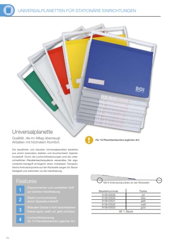 UNIVERSALPLANETTEN F%u00dcR STATION%u00c4RE EINRICHTUNGEN701234UniversalplanetteDie bew%u00e4hrten und robusten Universalplanetten bestehen aus einem besonders stabilen und bruchsicheren Spezialkunststoff. Durch die Lochschlitzstanzungen sind die unterschiedlichen Planettentaschensysteme verwendbar. Der ergonomische Handgriff erm%u00f6glicht einen m%u00fchelosen Transport. Sechs Antirutschpunkte auf der R%u00fcckseite sorgen f%u00fcr Standfestigkeit und erleichtern so die Handhabung.Qualit%u00e4t, die im Alltag %u00fcberzeugt. Arbeiten mit h%u00f6chstem Komfort.Ergonomischer und verst%u00e4rkter Griffzur leichten HandhabungStabil und bruchsicherdurch SpezialkunststoffRobuster Deckel in f%u00fcnf verschiedenen Farben (gr%u00fcn, wei%u00df, rot, gelb und blau)Lochschlitzstanzungf%u00fcr 15 Planettentaschen jeglicher ArtFeaturesBestellnummer Farbe9108-00529 rot9108-00530 blau9108-00531 gelb9108-00532 wei%u00df9108-00533 gr%u00fcnVE 1 St%u00fcckMit 6 Antirutschpunkten an der R%u00fcckseiteF%u00fcr 15 Planettentaschen jeglicher Art. !