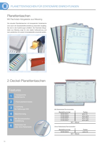 PLANETTENTASCHEN F%u00dcR STATION%u00c4RE EINRICHTUNGEN72123456Planettentaschen Die robusten Planettentaschen mit transparenter Vordertasche sind durch die Gewebestreifenverst%u00e4rkung besonders langlebig. Sie sind in drei Ausf%u00fchrungen erh%u00e4ltlich. Die Flachstab-H%u00e4ngeleiste aus Messing sorgt f%u00fcr eine stabile Aufbewahrung undkann problemlos mit unserer Universalplanette verwendet werden.2-Deckel-PlanettentaschenBestellnummer Farbe9208-00544 grau-rotVE 1 St%u00fcckBestellnummer Farbe9208-00541 grau-rot9108-00025 grau-gr%u00fcn9108-00037 grau-blau9108-00047 grau-gelbVE 1 St%u00fcckOhne Reiterleiste/TerminstreifenMit Reiterleiste/TerminstreifenMit Flachstab-H%u00e4ngeleiste aus MessingFeatures1 transparente Vordertasche1 Formularklemmleiste1 Lochung f%u00fcr Heftzunge HZ4GleichformatigMit Gewebestreifenverst%u00e4rkungWahlweise mit oder ohne Reiterleiste
