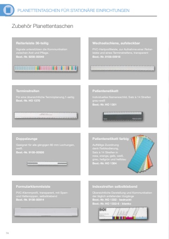 PLANETTENTASCHEN F%u00dcR STATION%u00c4RE EINRICHTUNGEN74Patientenetikett farbigAuff%u00e4llige Zuordnung dank Farbkodierung, Satz %u00e0 14 Streifen in rosa, orange, gelb, wei%u00df, grau, hellgr%u00fcn und hellblauBest.-Nr. HO 1364Indexstreifen selbstklebend%u00dcbersichtliche Darstellung und Kommunikation der t%u00e4glich anfallenden Vorg%u00e4ngeBest.-Nr. HO 1332 - bedrucktBest.-Nr. HO 1332-6 - blankoDoppelzungeGeeignet f%u00fcr alle g%u00e4ngigen 80 mm Lochungen, wei%u00df.Best.-Nr. 9108-00926PatientenetikettIndividuelles Namensschild, Satz %u00e0 14 Streifengrau-wei%u00dfBest.-Nr. HO 1301Reiterleiste 36-teiligSignale unterst%u00fctzen die Kommunikation zwischen Arzt und Pflege.Best.-Nr. 9208-00049Wechselschiene, aufsteckbarPVC-Hartprofilleiste, zur Aufnahme einer Reiterleiste und eines Terminstreifens, transparentBest.-Nr. 9108-00918TerminstreifenF%u00fcr eine %u00fcbersichtliche Terminplanung,1-seitigBest.-Nr. HO 1370FormularklemmleistePVC-Klemmprofil, transparent, mit Sperrund Haltenoppen, selbstklebendBest.-Nr. 9108-00914Zubeh%u00f6r Planettentaschen