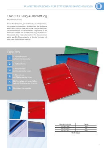 PLANETTENTASCHEN F%u00dcR STATION%u00c4RE EINRICHTUNGEN771234561 Klarsichttasche auf dem Vorderdeckel1 Heftmechanik2 Klemmleisten am Vorderdeckel innen1 Klemmleiste am R%u00fcckendeckel innenF%u00fcr Formulare mit Lang-Au%u00dfenheftung, Lochabstand 275 mmRundstab-H%u00e4ngeleisteFeaturesStan 1 f%u00fcr Lang-Au%u00dfenheftungBestellnummer Farbe9208-00309 blau9208-00310 rot9208-00307 gr%u00fcnVE 1 St%u00fcckDiese Planettentasche, passend f%u00fcr alle Universalplanetten, ist umfassend ausgestattet. Sie besitzt auf der Vorderseite eine Klarsichttasche, sowie eine Einstecklasche. Der Vorderdeckel ist innen mit zwei Klemmleisten ausgestattet. An der R%u00fcckwand befindet sich ebenfalls eine integrierte FormularKlemmleiste. Eine Heftmechanik nimmt Ihre Dokumentation sicher auf. Die Planettentasche ist f%u00fcr alle Formulare mit einer Lang-Au%u00dfenheftung geeignet.Planettentasche