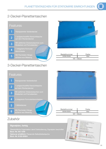 PLANETTENTASCHEN F%u00dcR STATION%u00c4RE EINRICHTUNGEN8512345612345Signalplan, farbig%u00dcbersichtliche Organisation dank Farbkodierung, Signalplan beschriftet Best.-Nr. HO 1349Optional erh%u00e4ltlich: Passende SelbstklebetascheBest.-Nr. 9108-00924Zubeh%u00f6r3-Deckel-PlanettentaschenFeaturesTransparenter Vorderdeckel1 aufgeschwei%u00dfte Klarsichttascheauf dem R%u00fcckendeckelMit seitlichen Dreieckstaschen zum Einstecken von Formularecken4 integrierte Formularklemmleisten1 MitteldeckelMit Flachstab-H%u00e4ngeschiene aus MessingBestellnummer Farbe9208-00353 blauVE 1 St%u00fcck2-Deckel-PlanettentaschenFeaturesTransparenter Vorderdeckel1 aufgeschwei%u00dfte Klarsichttascheauf dem R%u00fcckendeckelMit seitlichen Dreieckstaschen zum Einstecken von Formularecken1 integrierte FormularklemmleisteMit Flachstab-H%u00e4ngeschiene aus MessingBestellnummer Farbe9208-00494 blauVE 1 St%u00fcck