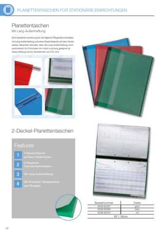 PLANETTENTASCHEN F%u00dcR STATION%u00c4RE EINRICHTUNGEN8612342-Deckel-PlanettentaschenMit Lang-Au%u00dfenheftungEine bew%u00e4hrte Ausf%u00fchrung f%u00fcr die t%u00e4gliche Pflegedokumentation mit Lang-Au%u00dfenheftung und einer Klarsichttasche auf dem Vorderdeckel. Beachten Sie bitte, dass die Lang-Au%u00dfenheftung nicht automatisch f%u00fcr Formulare mit 4-fach-Lochung geeignet ist. Diese Heftung hat ein Sonderma%u00df von 275 mm!Planettentaschen Bestellnummer Farbe9208-00307 gr%u00fcn9208-00309 blau9208-00310 rotVE 1 St%u00fcckFeatures1 Klarsichttasche auf dem Vorderdeckel 3 integrierte FormularklemmleistenMit Lang-Au%u00dfenheftungMit Rundstab-H%u00e4ngeschiene aus Fiberglas