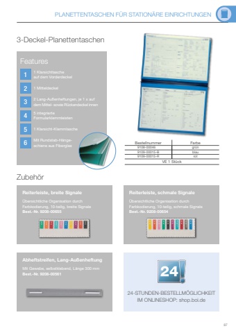 PLANETTENTASCHEN F%u00dcR STATION%u00c4RE EINRICHTUNGEN87123456Reiterleiste, breite Signale%u00dcbersichtliche Organisation durch Farbkodierung, 10-teilig, breite SignaleBest.-Nr. 9208-00655Reiterleiste, schmale Signale%u00dcbersichtliche Organisation durch Farbkodierung, 10-teilig, schmale SignaleBest.-Nr. 9208-00654Abheftstreifen, Lang-Au%u00dfenheftungMit Gewebe, selbstklebend, L%u00e4nge 300 mmBest.-Nr. 9208-0056124-STUNDEN-BESTELLM%u00d6GLICHKEIT IM ONLINESHOP: shop.boi.de3-Deckel-PlanettentaschenBestellnummer Farbe9108-00046 gr%u00fcn9109-00015-B blau9109-00015-R rotVE 1 St%u00fcckZubeh%u00f6rFeatures1 Klarsichttasche auf dem Vorderdeckel 1 Mitteldeckel2 Lang-Au%u00dfenheftungen, je 1 x auf dem Mittel- sowie R%u00fcckendeckel innen5 integrierte Formularklemmleisten1 Klarsicht-KlemmlascheMit Rundstab-H%u00e4ngeschiene aus Fiberglas
