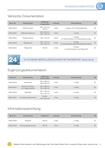 9124-STUNDEN-BESTELLM%u00d6GLICHKEIT IM ONLINESHOP: shop.boi.deBASISDOKUMENTATION! Weitere Informationen und Abbildungen der Formulare finden Sie in unserem Shop unter: shop.boi.deVerk%u00fcrzte DokumentationErg%u00e4nzungsdokumentationInformationssammlungBest.-Nr. Bezeichnung Endformat,Format offen Lochung Beschreibung VE9206-00449 SIS%u00ae ambulant 297 x 212 mm,DIN A3 4-fach 2-seitig, mit 6 Themenbereichen 509206-00451 Ma%u00dfnahmenplanung 297 x 200 mm, 297 x 370 mm 4-fach 2-seitig 509206-00452 Pflegekonferenz 297 x 172 mm 4-fach 2-seitig,zur Dokumentation von Teambesprechungen 509206-00453 Pflegebericht 297 x 157 mm,297 x 284 mm 4-fach 2-seitig,zur Dokumentation ge%u00e4nderter Ma%u00dfnahmenpl%u00e4ne 509206-00454 Pflegevisite DIN A4 4-fach 2-seitig,zur Dokumentation der Pflegevisite 50Best.-Nr. Bezeichnung Endformat,Format offen Lochung Beschreibung VE9206-00425 Assessment 297 x 200 mm,380 x 297 mm 4-fach 2-seitig 509206-00423 Bericht der Pflege,und Tagesereignisse297 x 158 mm,297 x 284 mm 4-fach 2-seitig 509206-00426 Tagesplan 297 x 150 mm, 297 x 275 mm 4-fach 2-seitig 509206-00424 Durchf%u00fchrungsnachweis DIN A4,297 x 395 mm 4-fach 2-seitig 50Best.-Nr. Bezeichnung Endformat Lochung Beschreibung VE9206-00336 Biografie DIN A4 4-fach 2-seitig 509206-00330 Versorgungsabsprachen DIN A4 4-fach 2-seitig 50