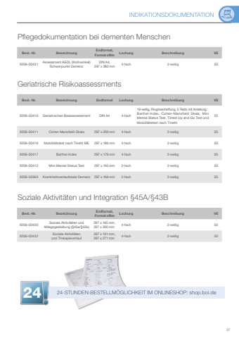INDIKATIONSDOKUMENTATION9724-STUNDEN-BESTELLM%u00d6GLICHKEIT IM ONLINESHOP: shop.boi.deBest.-Nr. Bezeichnung Endformat,Format offen Lochung Beschreibung VE9206-00431 Assessment AEDL (Krohwinkel)Schwerpunkt DemenzDIN A4,297 x 380 mm 4-fach 2-seitig 50Best.-Nr. Bezeichnung Endformat Lochung Beschreibung VE9206-00410 Geriatrisches Basisassessment DIN A4 4-fach16-seitig, Ring%u00f6senheftung, 5 Tests mit Anleitung : Barthel-Index, Cohen-Mansfield Skala, Mini Mental Status Test, Timed Up and Go Test und Mobilit%u00e4tstest nach Tinetti259206-00411 Cohen Mansfield-Skala 297 x 200 mm 4-fach 2-seitig 509206-00416 Mobilit%u00e4tstest nach Tinetti ME 297 x 186 mm 4-fach 2-seitig 509206-00417 Barthel-Index 297 x 179 mm 4-fach 2-seitig 509206-00412 Mini Mental Status Test 297 x 193 mm 2-fach 2-seitig 509206-00363 Krankheitsverlaufskala Demenz 297 x 169 mm 2-fach 2-seitig 50Pflegedokumentation bei dementen MenschenGeriatrische RisikoassessmentsBest.-Nr. Bezeichnung Endformat,Format offen Lochung Beschreibung VE9206-00430 Soziale Aktivit%u00e4ten und Alltagsgestaltung (%u00a745a/%u00a743b)297 x 165 mm,297 x 300 mm 4-fach 2-seitig 509206-00432 Soziale Aktivit%u00e4ten und Therapieverlauf297 x 151 mm,297 x 271 mm 4-fach 2-seitig 50Soziale Aktivit%u00e4ten und Integration %u00a745A/%u00a743B