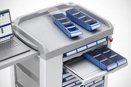Medikation: Transportwagen für Medikamente, die über sichere, abschließbare Fächer verfügen, um die Sicherheit und Integrität der Medikamente zu gewährleisten.