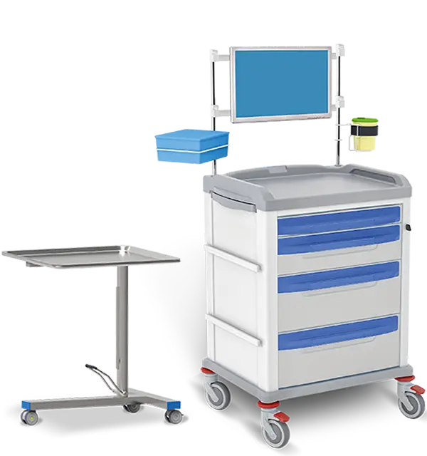 OP-Equipment: Funktional gestaltete Wagen für die Aufbewahrung und den Transport von OP-Instrumenten und -Zubehör.