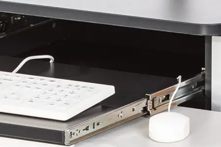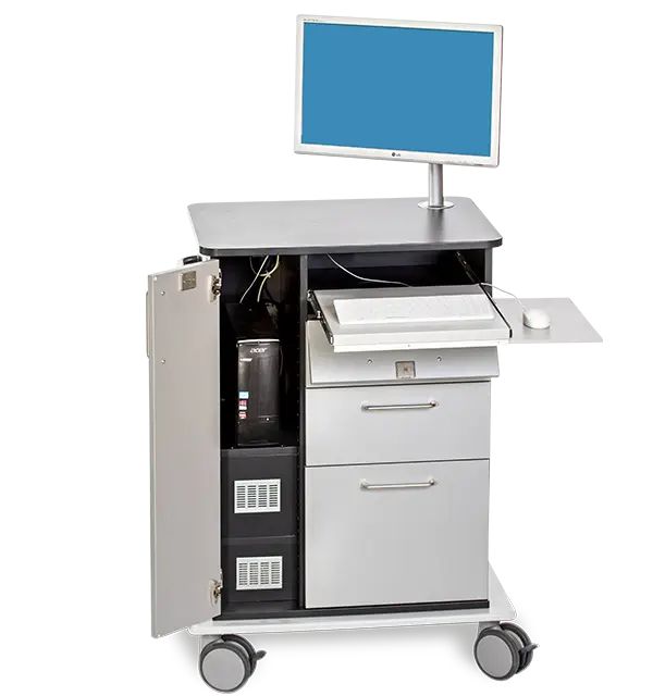 Der EDV-Computerwagen ist mit einem seitlichen Tastaturauszug, einer Mausablage sowie einem hochwertigen, stufenlos höhenverstellbaren Monitorarm ausgestattet. Die notwendigen Kabeldurchführungen für Ihre EDV sind hinter abschließbaren Türen untergebracht. Entsprechende Computerhardware wie z.B. Thinclients, Monitore, All-in-One-PC's und Powersysteme für kabelloses Arbeiten können vormontiert geliefert werden.