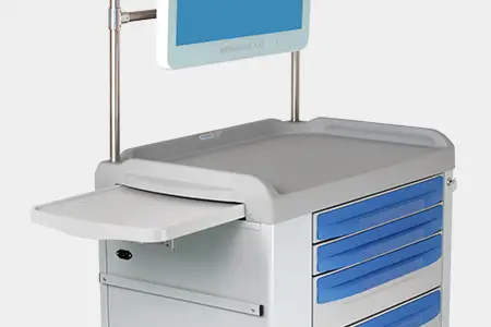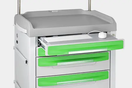 Mit dem Digital Upgrade erhält der Wagen eine zusätzliche Dimension der Nützlichkeit. Diese Erweiterung ermöglicht den problemlosen Anschluss von IT-Equipment, wie All-in-One PCs mit Tastaturen und Mäusen. Diese Funktionalität macht den Wagen zu einem mobilen Arbeitsplatz, der nicht nur die physische, sondern auch die digitale Patientenversorgung unterstützt. Die Möglichkeit, digitale Patientenakten direkt am Bett des Patienten zu bearbeiten oder Zugang zu telemedizinischen Anwendungen zu haben, verbessert die Effizienz und die Qualität der Pflege.