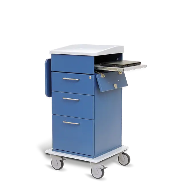 Die robust konstruierten EDV-Notebookwagen, gefertigt aus melaminharzbeschichteten Spezialplatten, optional mit einem widerstandsfähigen und kratzfesten ABS-Oberteil, bieten eine optimale Lösung für das dynamische Arbeitsumfeld in Krankenhäusern und Pflegeheimen. Ein seitlich abschließbarer Notebook-Auszug gewährleistet die Sicherheit und einfache Zugänglichkeit der Geräte. Optionale durchgängige Rohrgriffbügel auf der praktischen Arbeitsplatte erleichtern das Handling des Wagens erheblich.