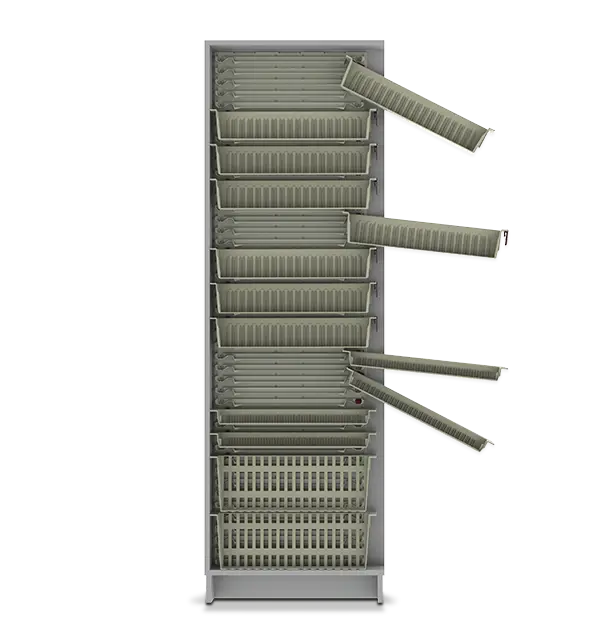 Die modulare Gestaltung des Systems erlaubt eine individuelle Anpassung an die spezifischen Anforderungen und Bedürfnisse Ihrer Einrichtung. Kippbare Module verbessern den Zugang zu höher gelegenen Lagerflächen, während Teleskopauszüge einen vollständigen Überblick über die Inhalte ermöglichen und für eine geordnete Aufbewahrung sorgen. Die Schrankinnenräume können durch den Einsatz stabiler Regalböden auch in kleineren Abständen strukturiert werden, was die Flexibilität und Effizienz des Lagersystems weiter steigert.